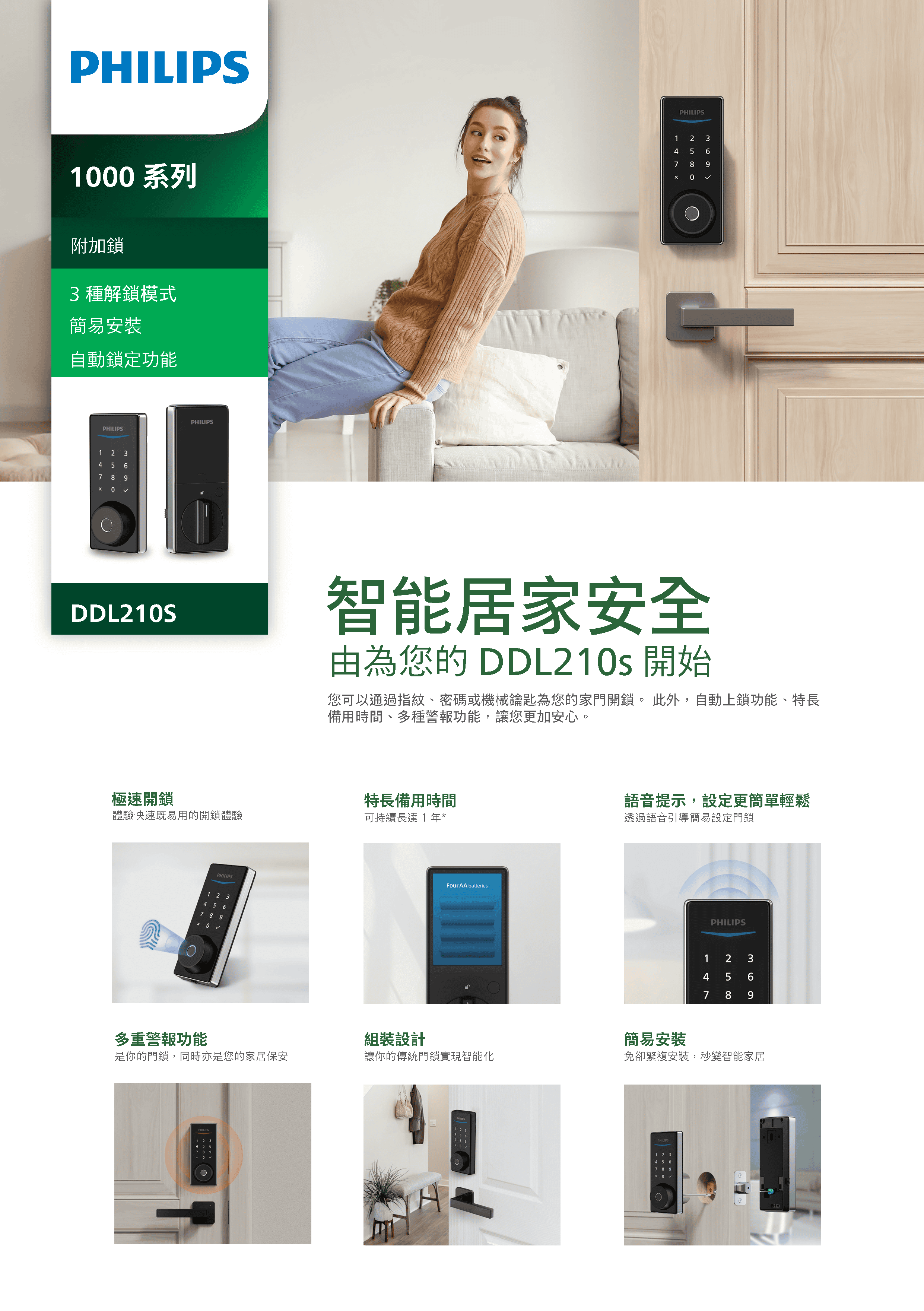 PHILIPS DDL210S 智能電子鎖 - 手指紋、密碼、機械匙)原裝行貨