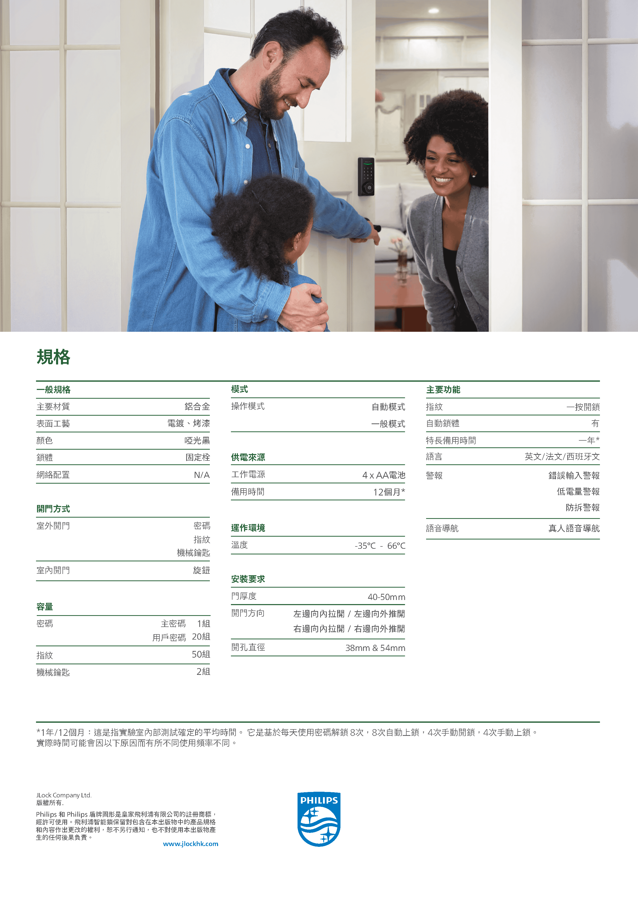Philips DDL210S 附加智能門鎖 智能居家安全 您可以通過指紋、密碼或機械鑰匙為您的 DDL210s 開鎖。 此外,自動上鎖功能、特長 備用時間、多種警報功能,讓您更加安心。 極速開鎖 特長備用時間 語音提示 簡易安裝