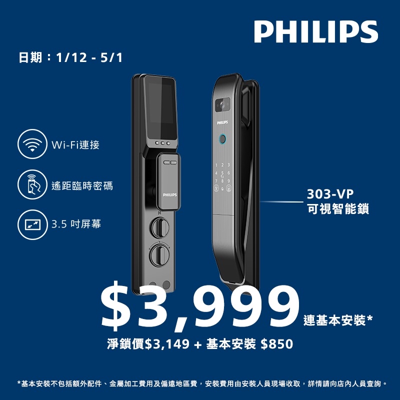 PHILIPS DDL303-VP 電子眼智能門鎖(紅古銅/曜石黑)|可視智能鎖(裝工 $850- 代理現場收)