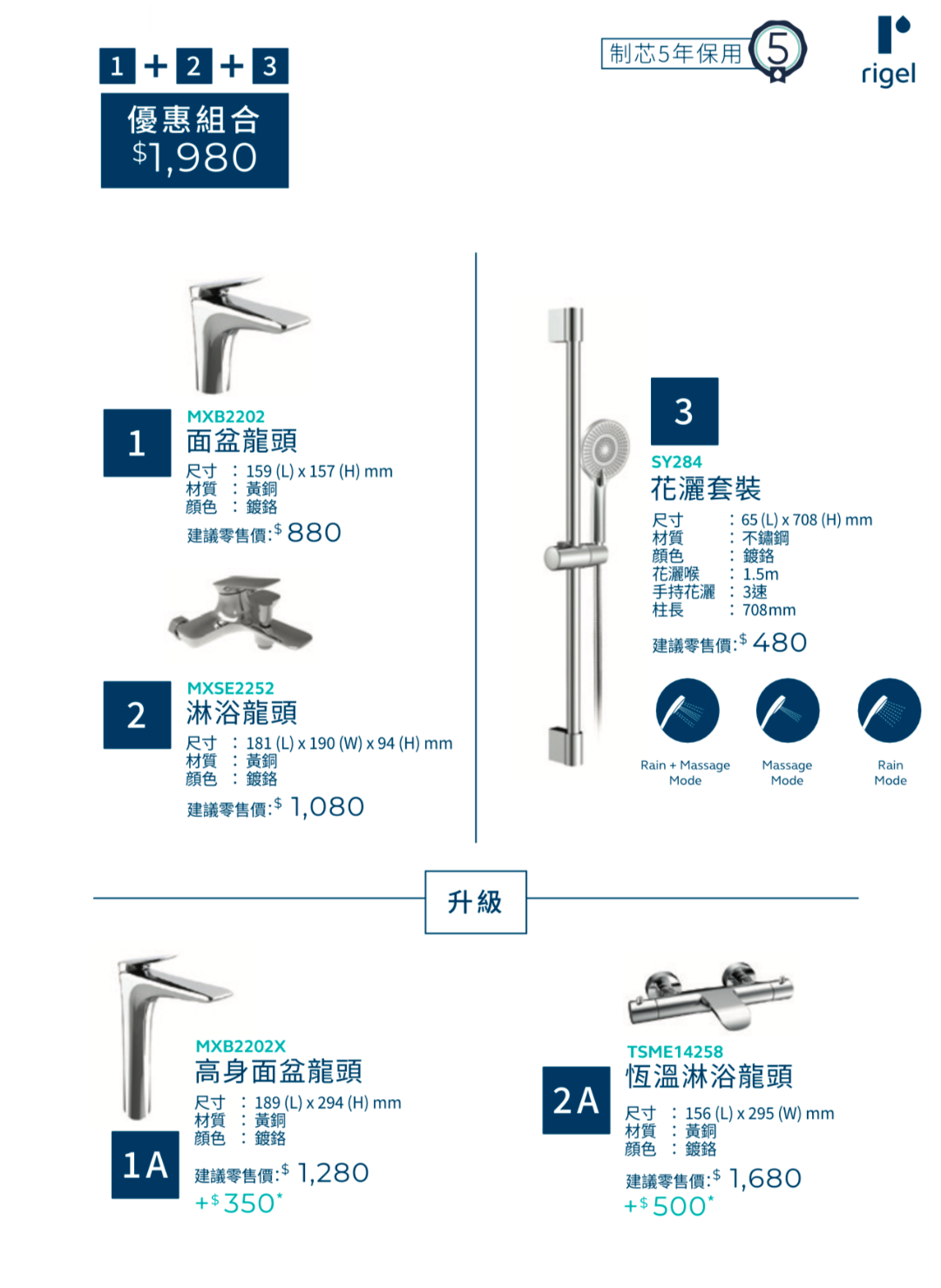 顏色:鍍鉻色 套裝包括: 1. MXB2202 矮身面盤龍頭 1A. MXB2202X 高身面盤龍頭 2. MXSE2252 浴缸龍頭 2A. TSME14258 恆溫浴缸龍頭 3. SY284 花灑套裝
