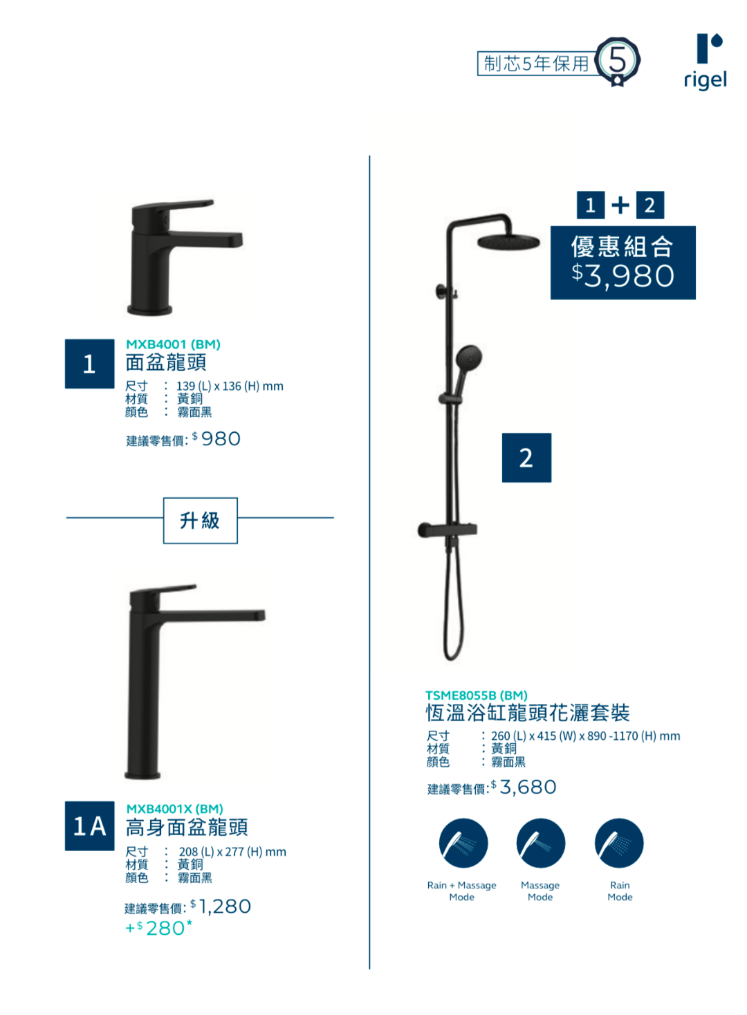 顏色:霧面黑 套裝包括: 1. MXB4001(BM)矮身面盤龍頭 1A. MXB4001X(BM) 高身面盤龍頭 2. TSME8055B(BM)恆溫浴缸龍頭花灑套裝