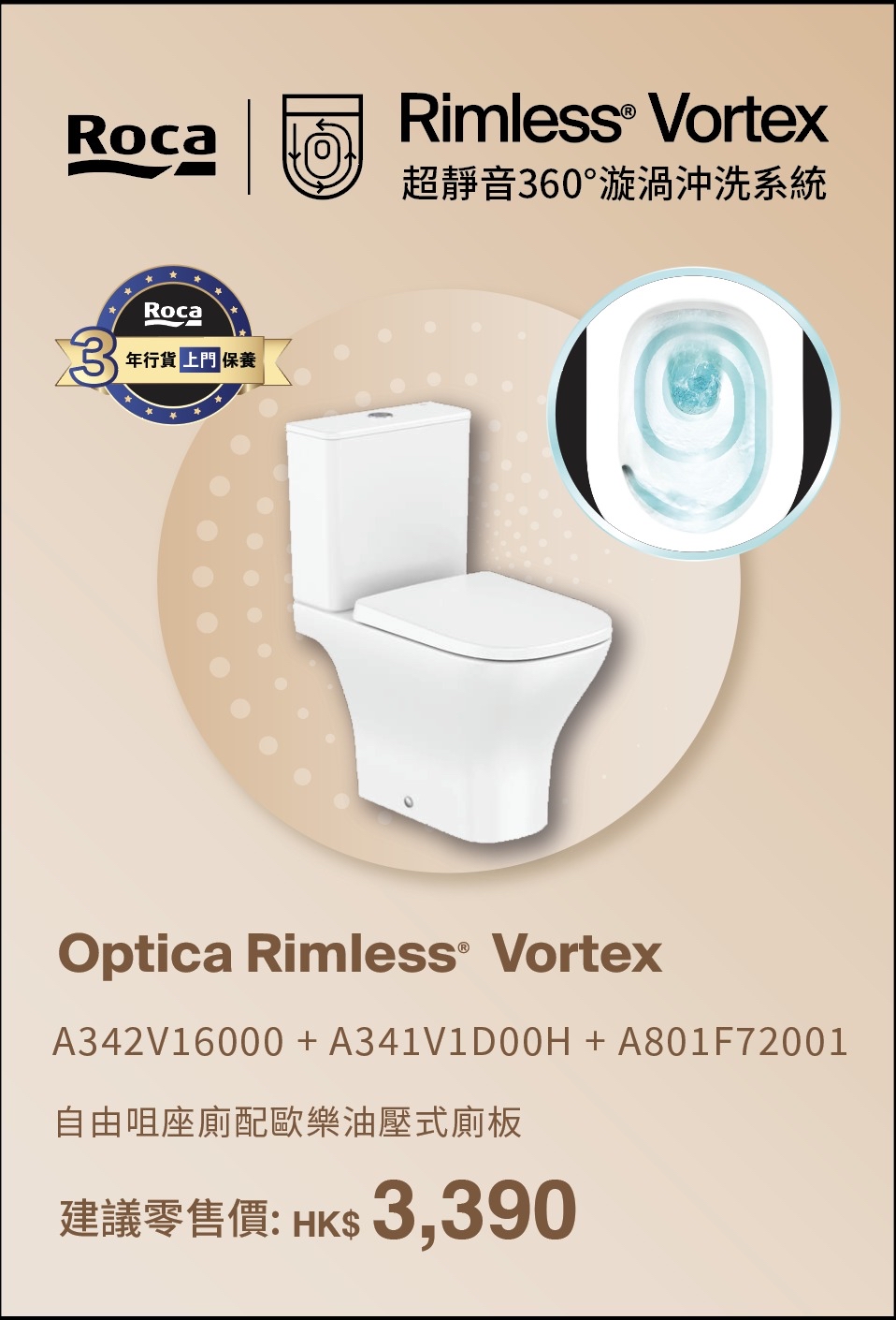 Roca Optica Rimless® Vortex 自由咀分體座廁配歐洲製造歐樂油壓板套裝 341V1D+342V16+801F72 (送英國風琴喉)